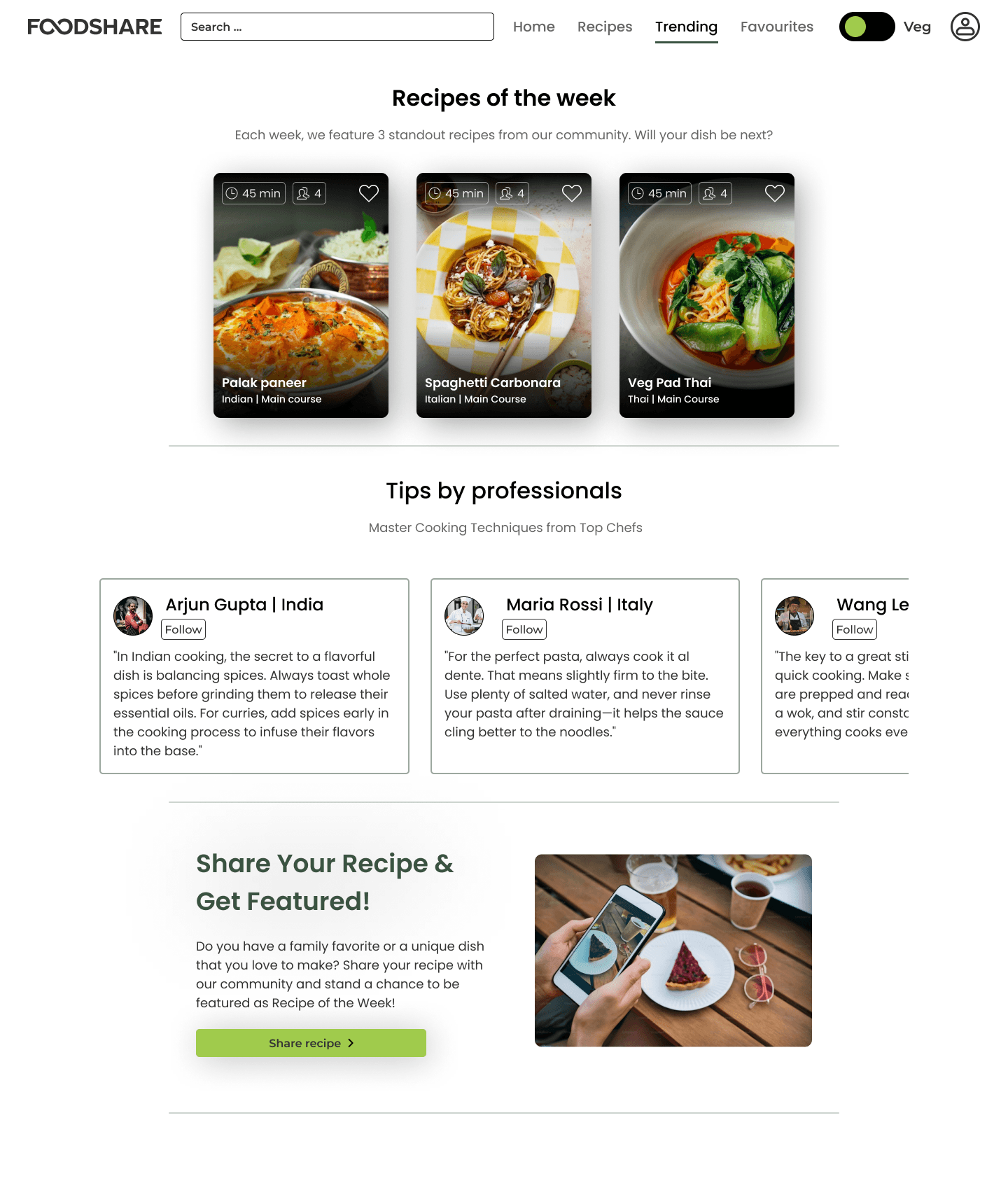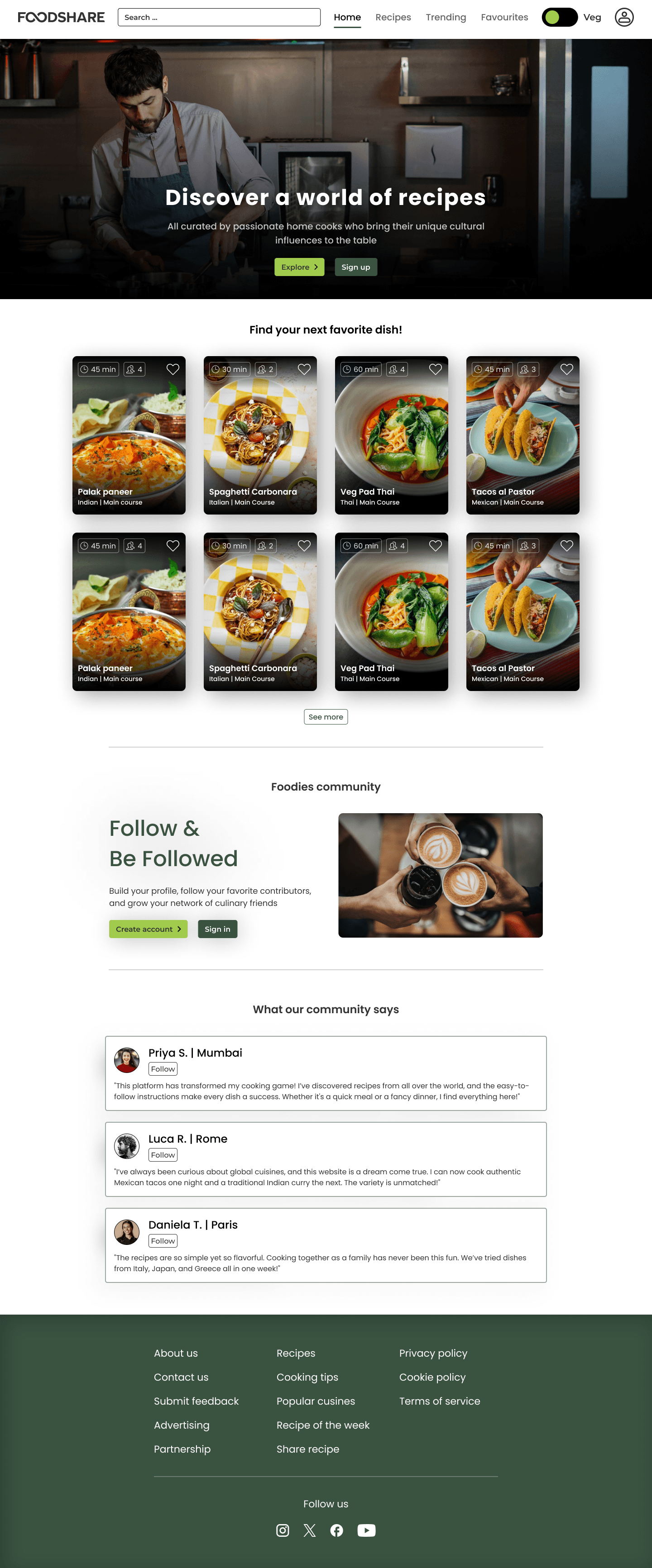 Many recipe platforms lack a balance between cultural authenticity and usability. Home cooks often struggle to find reliable recipes that align with their tastes, dietary needs, and time constraints. Foodshare addresses these gaps by creating a vibrant community-driven platform that celebrates global cuisines while offering personalized, accessible, and culturally enriched cooking experiences.